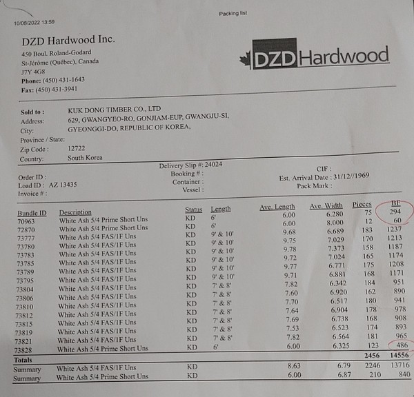 화요일 오전 북미에서 수입한 DZD사 북미산 화이트 애쉬 제재목 1CN 하역 작업을 진행 하였으며 회원님들께 저렴한 가격으로 판매 할 예정 입니다. 규격은 하단 Packing List 참고 해 주시면 감사하겠습니다.단가 및 구입 문의는 담당자에게 연락 주시면 빠른 피드백을 받아보실 수 있으시며 번들(300~500재)로 구매시 단가 협의 가능 하오니 참고 해 주십시요!^^