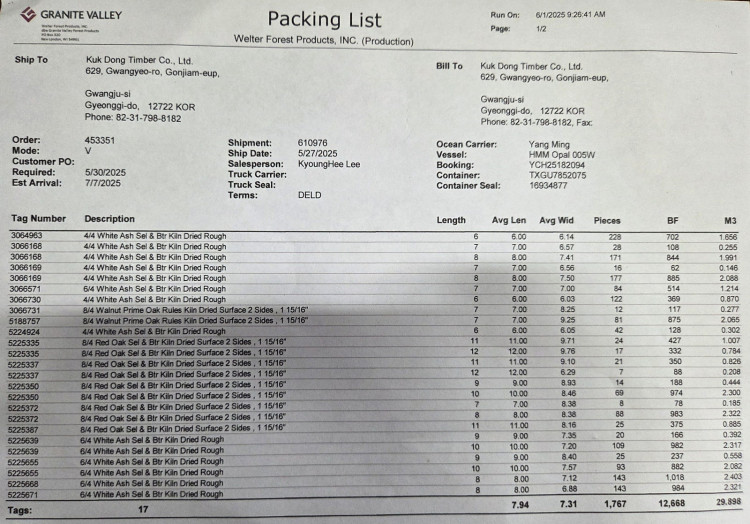 북미 GRANITE VALLEY 에서 수입한 북미산 화이트 애쉬/블랙 월넛/레드오크LUMBER(제재목)1CN 입고 하여 하역 작업을 진행 하였고 점심 시간 전 작업을 마무리 하여 제재목 보관 창고에 적재 시켰으며 회원님들께 저렴한 가격으로 판매 할 예정 입니다.^^b