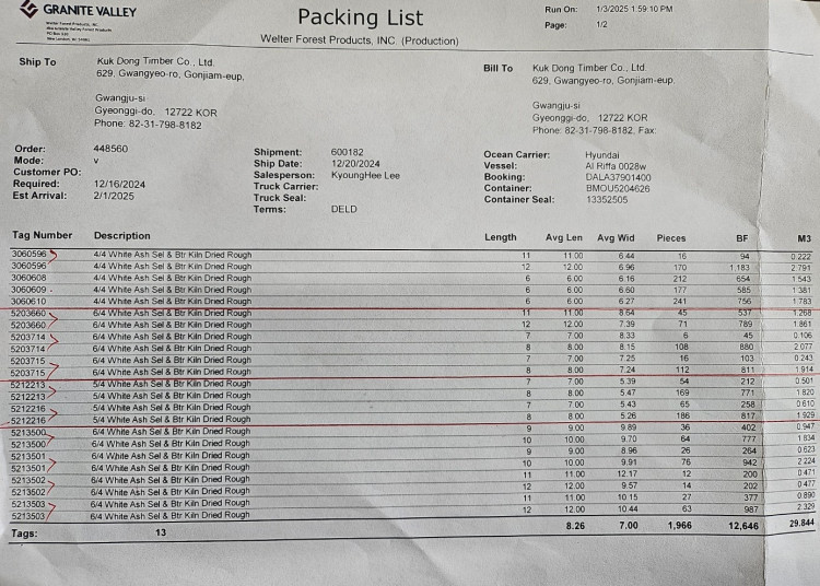 02월14일 금요일 오전 북미 GRANITE VALLEY사에서 수입한 화이트 애쉬 LUMBER(제재목) 1CN 입고